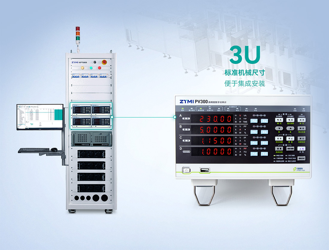 PV300功率計支持三通道信號測量,支持1500V電壓和50A電流直接測量,功率范圍廣。其機身為3U標準機械尺寸,方便集成安裝,同時標配多種通信接口,提供豐富的開發例程,廣泛應用于逆變器生產測試平臺、電源生產測試平臺。