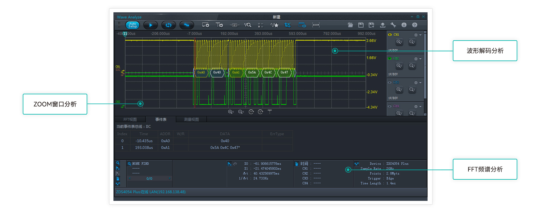 ZDS4000系列示波器免費標配時序分析功能,支持自定義參數配置對I2C、I2S、SPI、MIPI-RFFE、CAN、Reset、Switch進行分析處理。自動分析多個波形中最差情況是否滿足標準,可直接篩選某個特定節點并直接生成附帶截圖的報告。