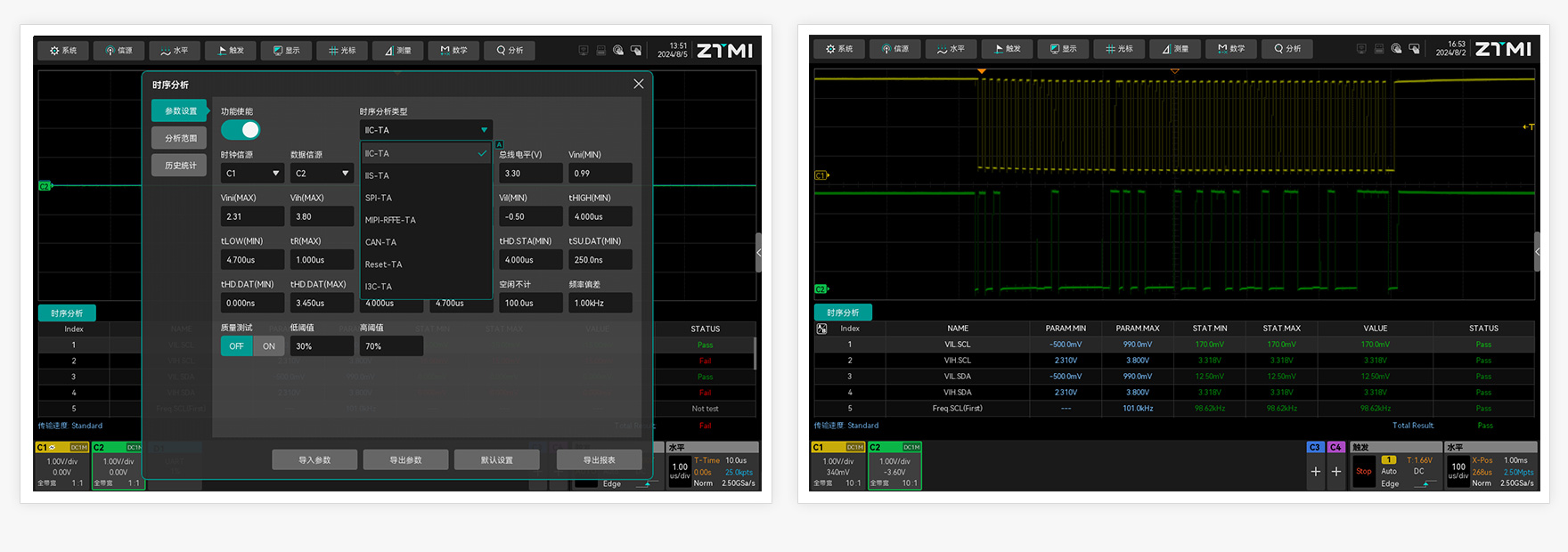 各種通信協議有嚴格的一致性測試要求,傳統手動測試效率,誤差大。ZUS5000系列可提供創新的時序分析功能,可分析CAN、IIC、IIS、SPI、Reset、Switch信號的脈寬、幅值、邊沿、建立時間、保持時間等參數,導出一致性測試報告。