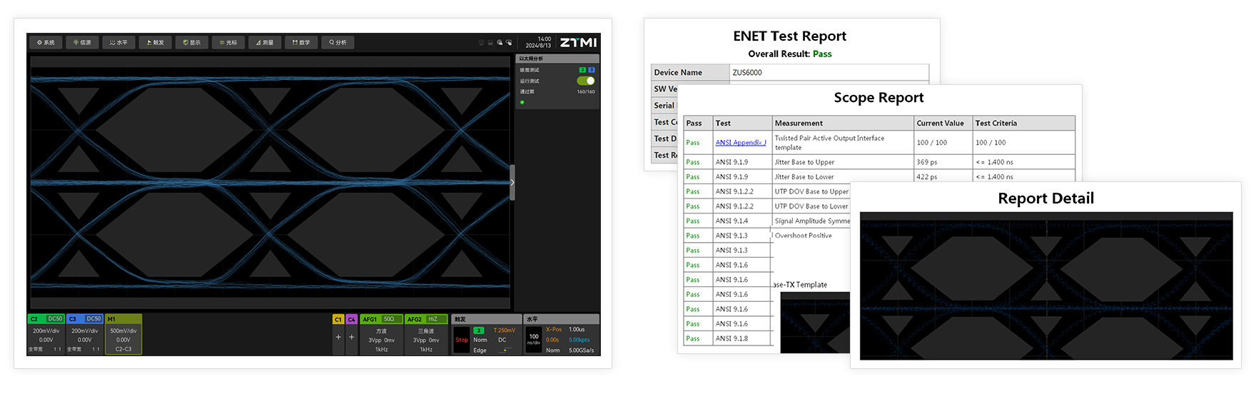 ZUS6000支持百兆以太網分析軟件,能夠自動測試以太網100Base-TX標準的信號特性,并在短時間內完成信號眼圖,傳輸特性分析,并與標準協議參數做對比,給出信號測試結果( Pass/Fail ),并支持完整測試報告的導出。
