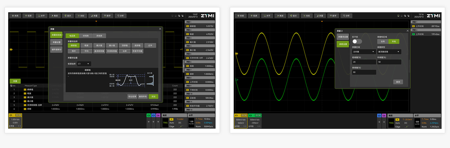 在之前的示波器產品中,所有的測量參數使用的是同一閾值設置,如果要測試兩個不同高度的上升時間,就需要將示波器暫停,通過修改配置做兩次測量。ZUS6000可針對測量參數做獨立的閾值設置,實現針對同一信號、在同一時刻,顯示不同的測量結果。