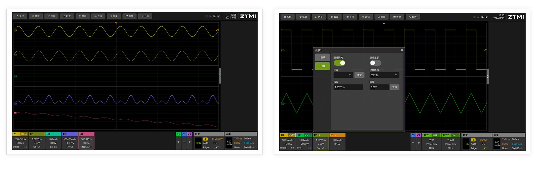 ZUS6000支持同時增加多達4個不同公式的波形運算,不同運算結果可以顯示在不同的波形窗口,讓工程師看到更多的視角和細節。運算通道可以選擇顯示與隱藏,同時不影響運算的正常進行,操作靈活,滿足更多場合需求。