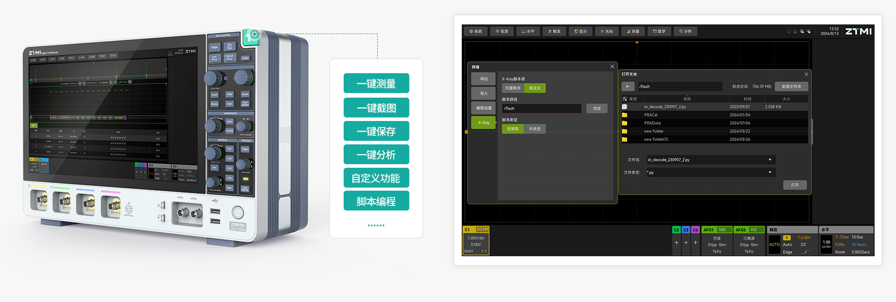 不同工程師使用示波器有不同的習慣操作,為了滿足不同工程師的習慣需求,ZUS6000創新性的推出了自定義按鍵X-Key,工程師可以通過X-Key定制示波器操作、參數測量、波形保存、腳本分析等各種動作和功能,給您更多的自由選擇。