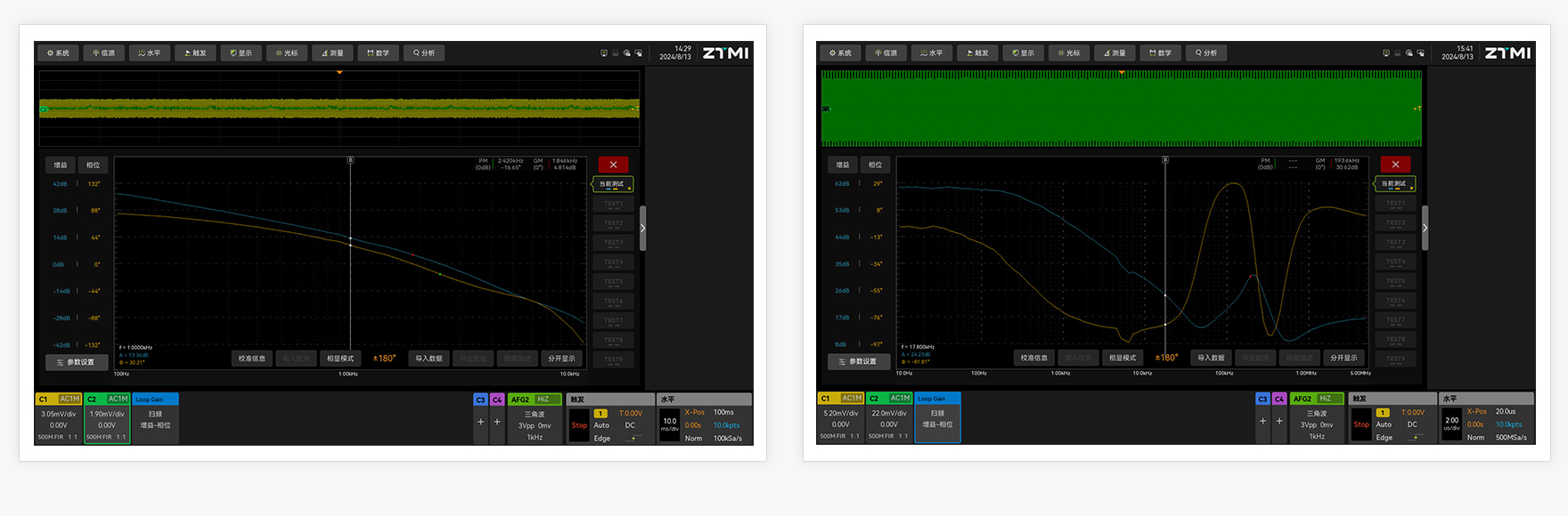 穩定的反饋環路對開關電源來說是非常重要的,伯德圖可以直觀呈現負反饋系統的增益、相位的頻率響應曲線,進而可以判斷控制系統是否穩定。電源紋波抑制比(PSRR)也是電源重要的性能參數,評估電源電壓發生變化時,對輸出的電壓影響大小,ZUS6000提供的環路分析功能,配合信號注入器可以實現PSRR的快速測試。