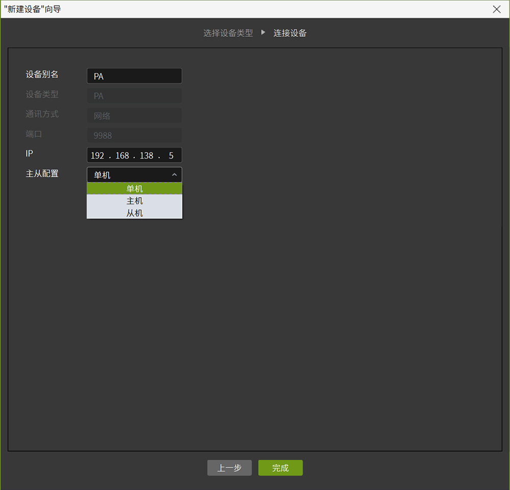 功率分析儀連接:選擇功率分析儀后,在其設(shè)置界面(圖4)中,需設(shè)置IP地址并確認(rèn)單機(jī)或并機(jī)(主機(jī)、從機(jī))模式,完成連接。