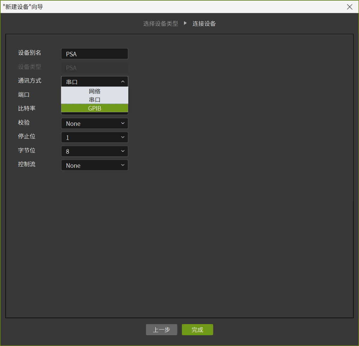 PSA系列電源連接:如圖6所示,支持以太網(wǎng)、串口、GPIB三種連接方式,不同方式下參數(shù)設(shè)置各異,需要用戶根據(jù)自身情況進(jìn)行選擇匹配。