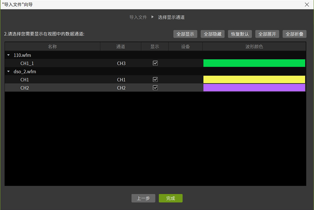 點(diǎn)擊主頁(yè)面"文件分析",或在開(kāi)始菜單中點(diǎn)擊"導(dǎo)入文件",可以打開(kāi)加載文件窗口。選擇加載文件,加載后可對(duì)文件中的信號(hào)源信息進(jìn)行編輯修改,以便更好地進(jìn)行數(shù)據(jù)分析,如圖8、圖9所示。