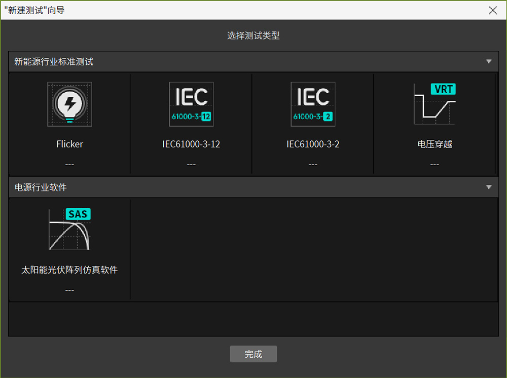 MTA軟件具有豐富的擴(kuò)展軟件分析功能,通過(guò)點(diǎn)擊主頁(yè)面"執(zhí)行測(cè)試",或在開(kāi)始菜單中點(diǎn)擊"新建測(cè)試",可以打開(kāi)執(zhí)行測(cè)試窗口。在窗口中可以選擇Flicker、IEC61000-3-12、IEC61000-3-2、電壓穿越、太陽(yáng)能光伏陣列仿真等功能,如圖11所示,此部分功能需要license激活使用。