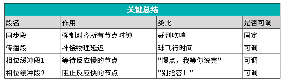 有些隊友(節點)反應太快,這個階段是防止他們搶跑。如果信號邊沿來得比預期早,會縮短這個段來重新同步。長度可調。相當于接球人如果提前伸手了,你就喊"別急!按節奏來!"